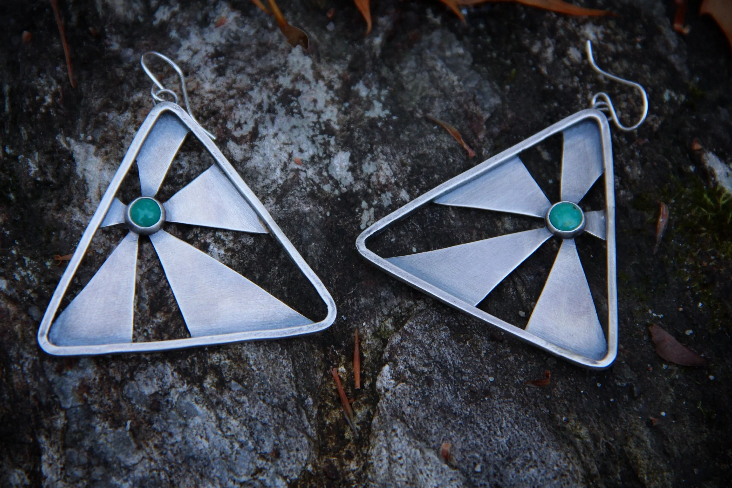 Sterling silver and Kingman turquoise. Earrings are carefully sawn out by hand. Sterling silver earring wires.