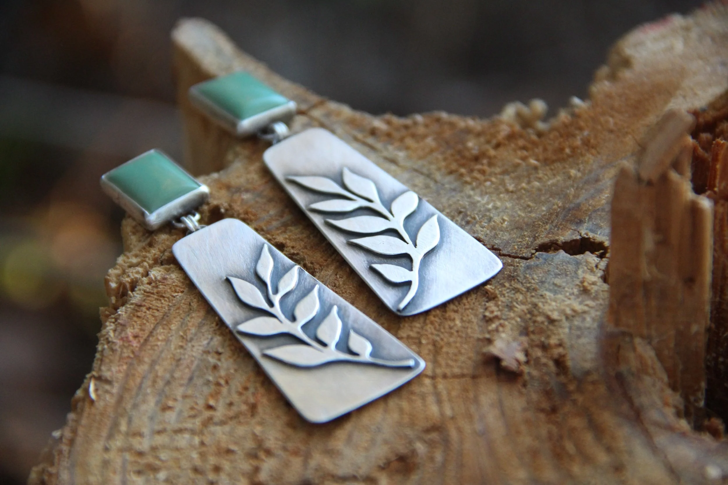 A beautiful green shade of turquoise wrapped in fine silver and set on a sterling silver backplate. Paired with hand-sawn sterling silver botanicals. Solid, yet easy on the ears for such a statement pair!