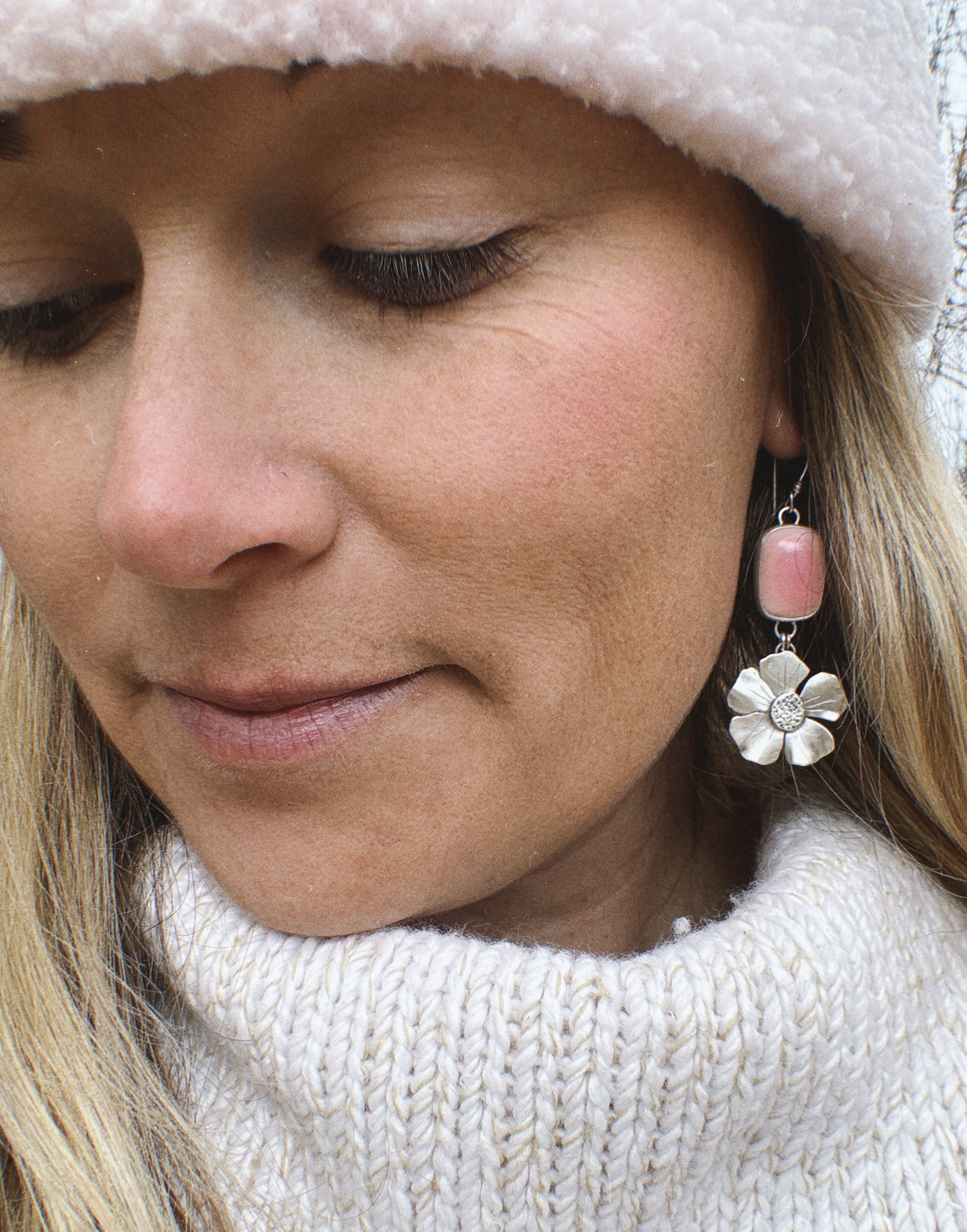 Queen conch shell + sterling silver. Hand sawn cherry blossom flowers. Handmade sterling silver earring wires.